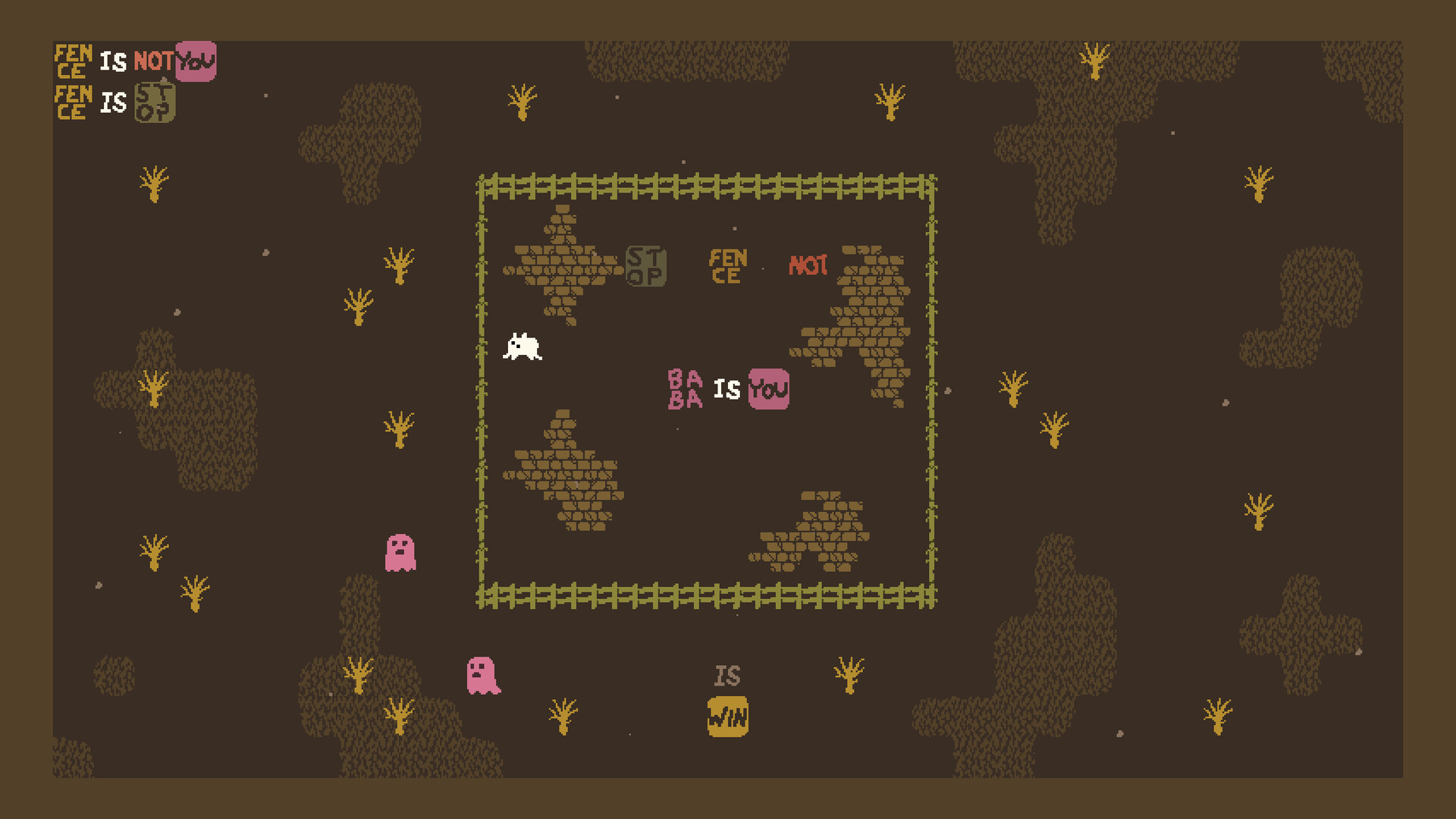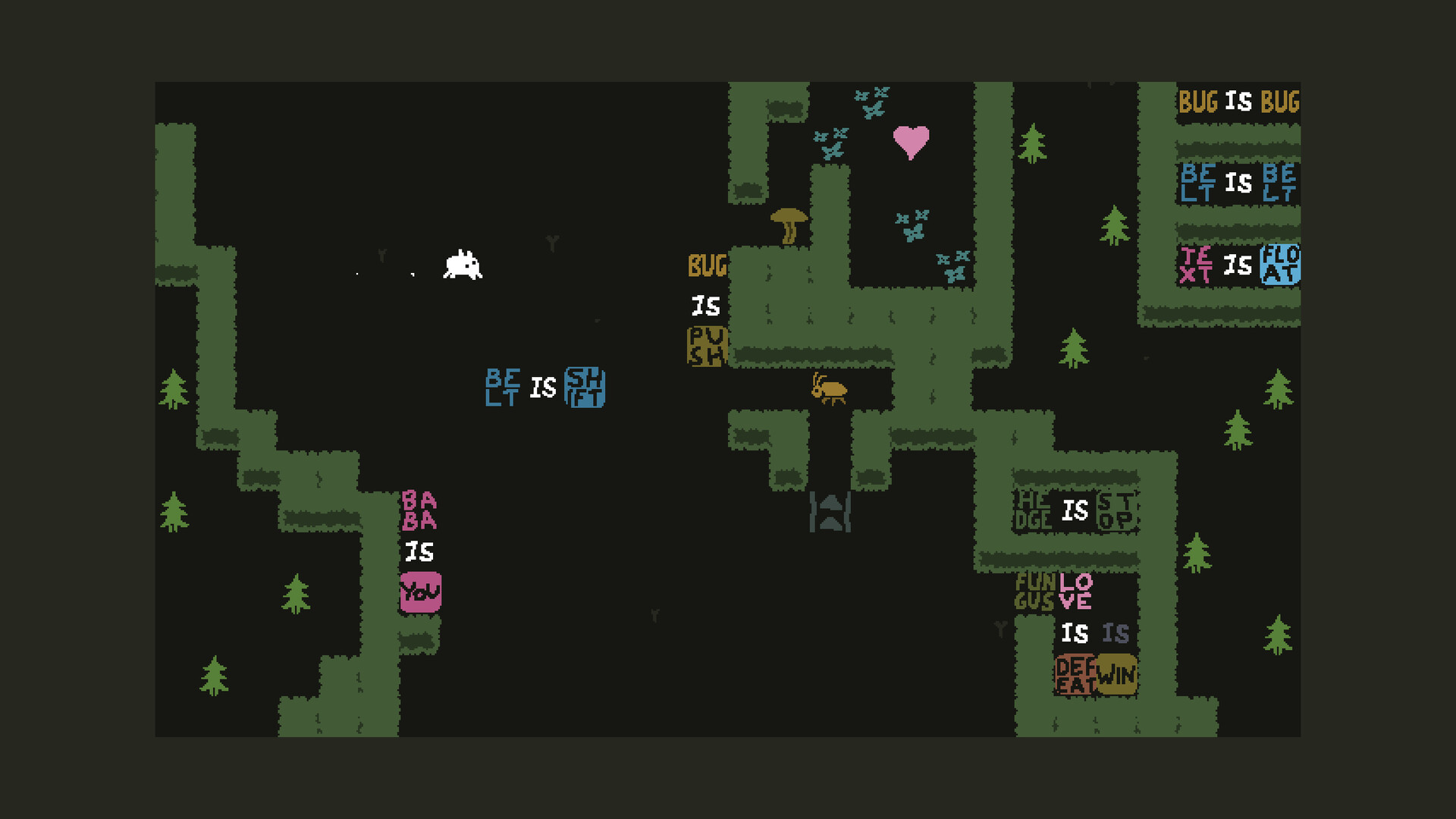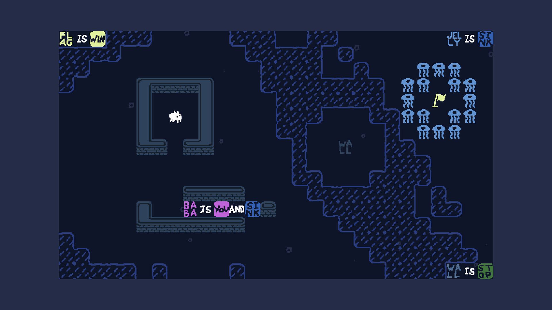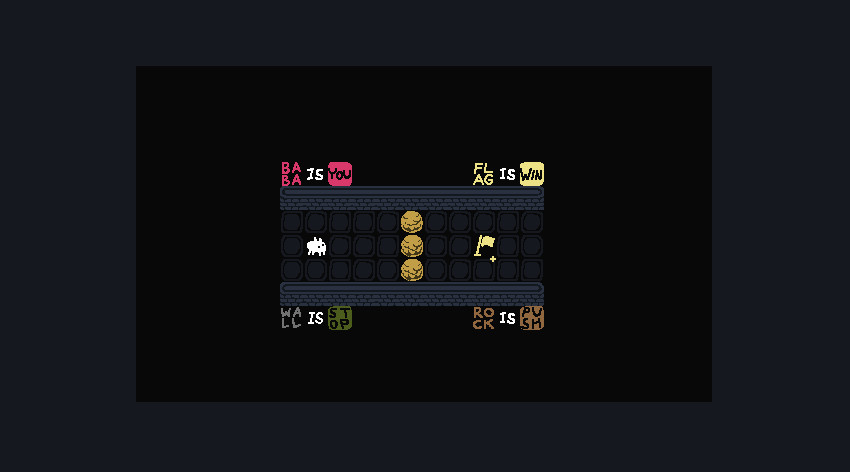 Baba Is You is a puzzle game where the rules you have to follow are present as blocks you can interact with. By manipulating them, you can change how the game works, repurpose things you find in the levels and cause surprising interactions!
