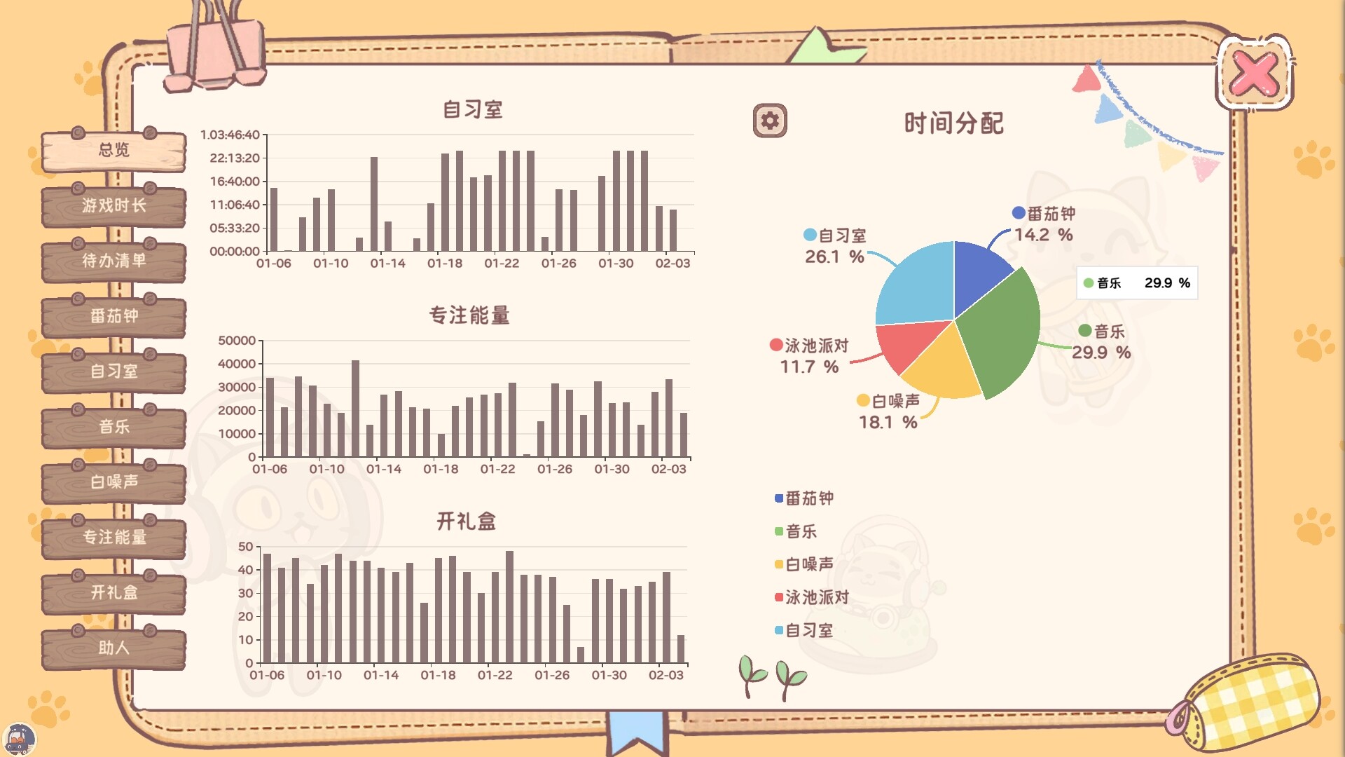 内置番茄钟、Lo-Fi 音乐(50+)、白噪音(36);用「猫巴士」把多个迷你工具收纳到桌面角落,互不打扰,随取随用。